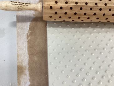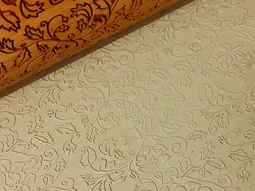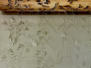 I have always loved embossed leather. This lacy design is roughly based on the intricately tooled embossed leather design of a much loved handbag. Combined with Keane's 33 warm clay, or any other iron rich clay, the similarity to embossed leather warms my heart!